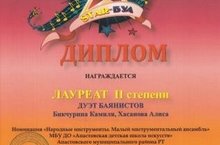 МБУ ДО «Апастовская детская школа искусств» Апастовского МР РТ. Руководитель Хисамов Фатых ГаязовичЛАУРЕАТ II СТЕПЕНИ в номинации «Инструментальное исполнительство. Учитель-ученик». Смешанная возрастная категория Хисамов Фатых, Залялиев Сайдар. МБУ ДО «Апастовская детская школа искусств» Апастовского МР РТ. Преподаватель Хисамов Фатых Гаязович