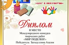 В международном конкурсе творческих работ "МИР ПОДЕЛКИ!" Загидуллина Азалия в номинации дизайн удостоилась Диплома 2 степени (руководитель Валиева И.Т.)