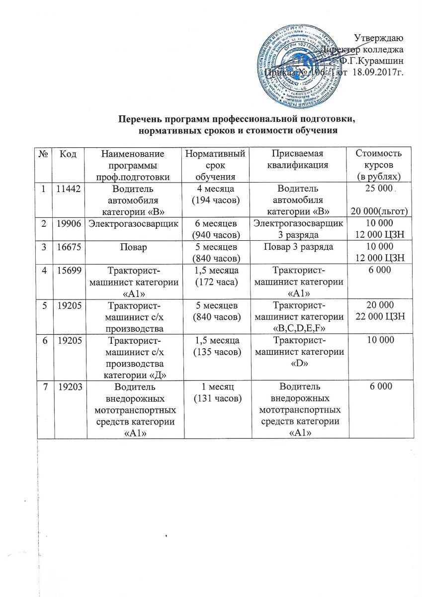 Документ об утверждении стоимости обучения по каждой образовательной программе