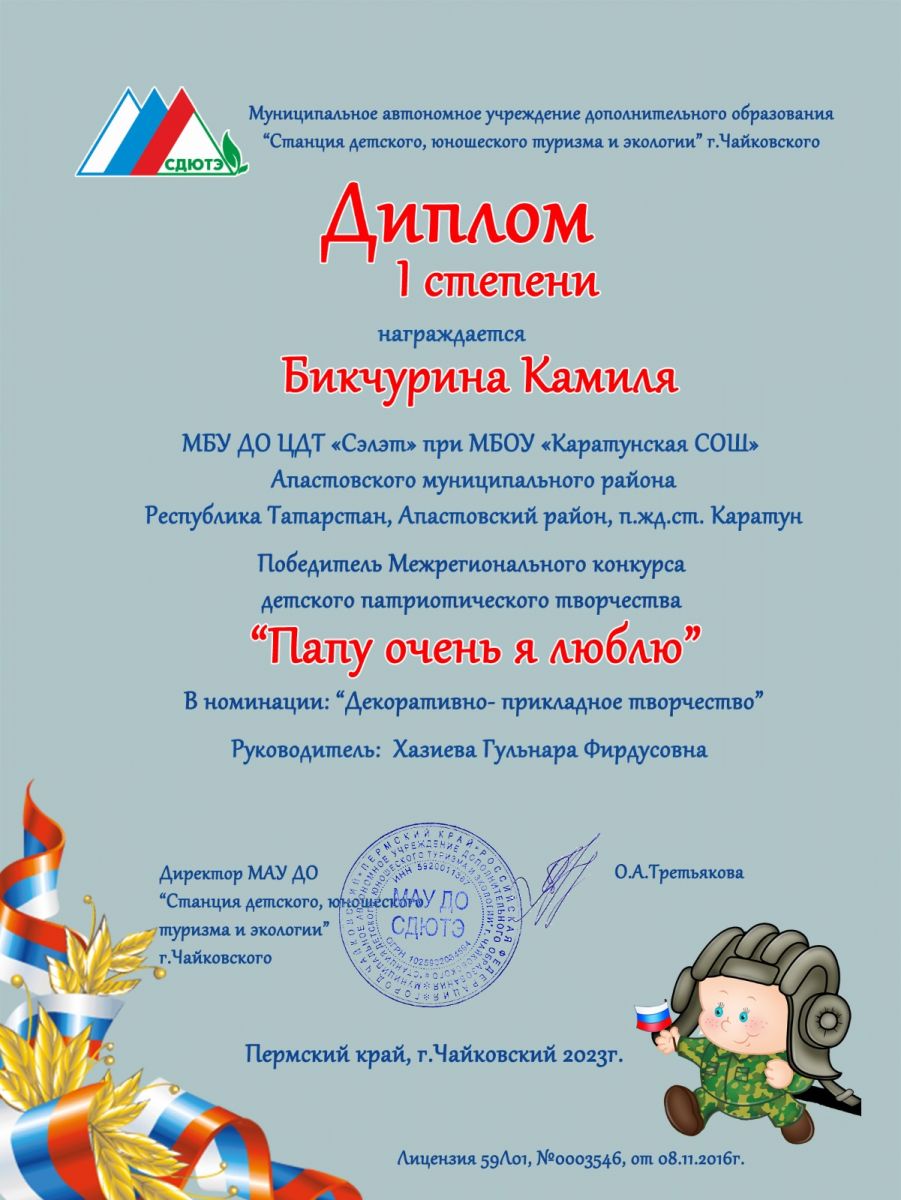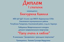 Бикчурина Камиля- обучающаяся объединения «Для души» под руководством педагога Хазиевой Гульнары Фирдусовны приняла участие в Межрегиональном конкурсе детского патриотического творчества "Папу очень я люблю", в номинации "Декоративно-прикладное творчество" и была награжднна дипломом 1 степени.