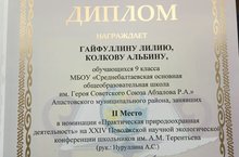 Обучающиеся 9-го класса МБОУ "Среднебалтаевская школа им.Героя Советского Союза Абзалова Р.А." (Гайфуллина Л. и Колкова А.), заняли II место в номинации "Практическая природоохранная деятельность" на XXIV Поволжской научной экологической конференции школьников им. А.М.Терентьева (рук.Нуруллина А.С.) и были награждены Дипломом Министерства образования и науки РТ.