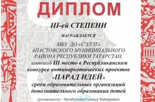 17 апреля 2017 года на базе ДК Менжинского прошла церемония награждения победителей и призёров Республиканских конкурсов и фестивалей.В конкурсе антинаркотических профилактических проектов среди образовательных организаций дополнительного образования «Парад идей»в туристско-краеведческом направлении МБУ ДО ЦДТ «Сэлэт» Апастовского муниципального района (руководитель – педагог дополнительного образования Насибуллина Гульнур Хайдаровна) заняла 3 место. Поздравляем!