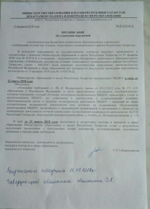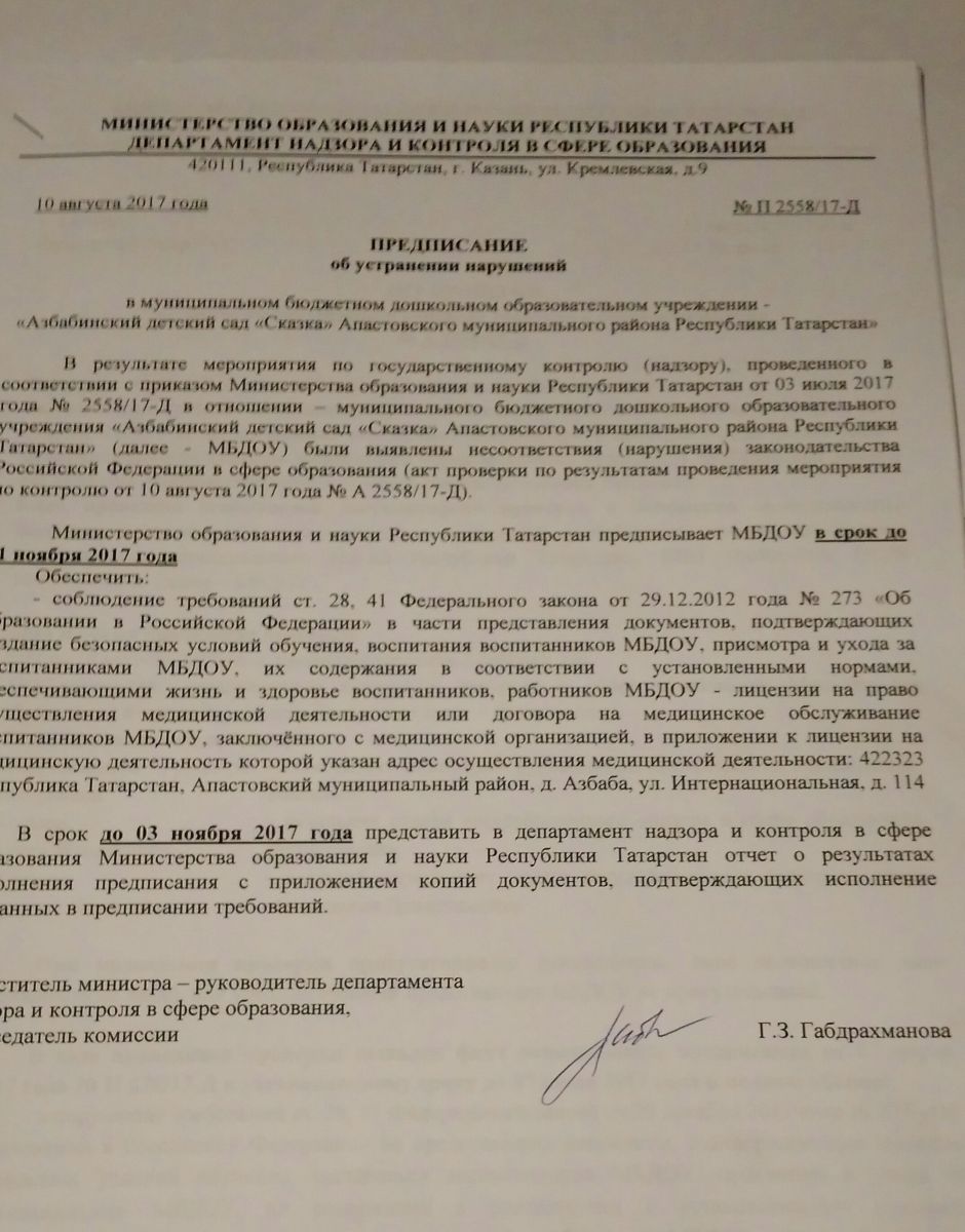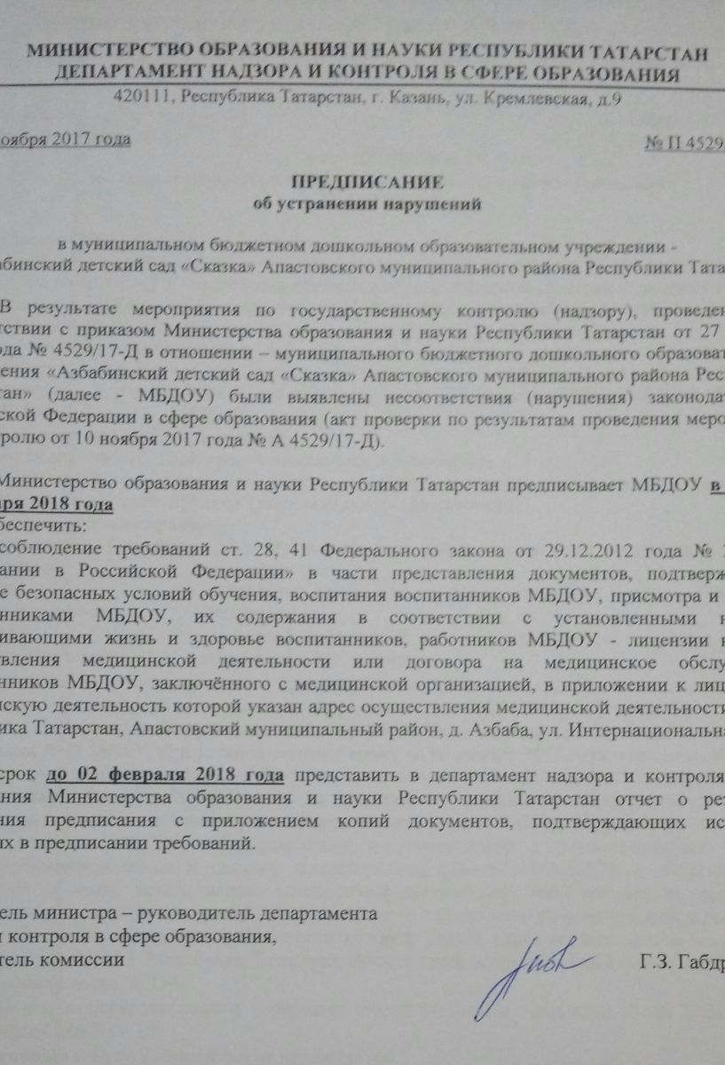 Предписание Департамента об устранений нарушений от 10.08.17г.