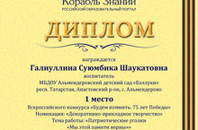 Воспитательница Галиуллина Суюмбика Шаукатовна участвовала на Всероссийском конкурсе "Будем помнить. 75 лет Победы" в номинации "Декоративно-прикладное творчество", тема работы: "Патриотические уголки" Мы этой памяти верны." Награждена дипломом.