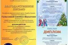 18.04.2020 году воспитанники детского сада Галимова Ильвина, Нуруллина Карим, Ахметзянов Ислам, Ахмадуллин Разил участвовали на Международном конкурсе "Детское творчество"- организованное в Российском образовательном портале “Корабль Знаний” и были награждены дипломами. Воспитатель МБДОУ «Альмендеровский детский сад« Бэллуки Галиуллина Суюмбика Шаукатовна была награждена Благодарственным письмом, за плодотворное сотрудничество и проводимую работу по подготовке и организации авторов работ представленных на конкурсы.