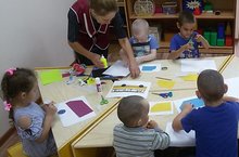 Балалар шөгелдә кәгазьдән симметрияле итеп кисеп, әзер формаларны билгеле бер тәртиптә ябыштыру күнекмәсен кабатладылар.