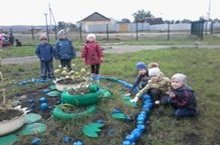 Рассматривание фигур из бросового материала на территории детского сада. Цель: прививать интерес и уважение к ручному труду; развитие связной речи, чувства цвета и эмоциональной направленности детей.