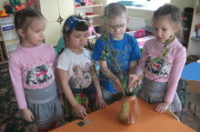 Дети подготовительной группы наблюдали за веточками, поставленными в вазу. На ветках распустились зелёненькие листочки. Здесь есть ветка клёна, ветка сирени, ветка берёзы, ветка вишни, ветка вишни.