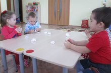 Дети на занятии по конструированию учились приему скатывания мягкой бумаги в комочки. Малыши, путем многократного сминания белого бумажного мягкого листочка и последующего скатывания его кругообразными движениями между ладошками, сделали снежные пушистые комочки. -