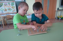 Дети подбирают по размеру гайку к болту. Игра развивает зрительную память, мелкую моторику и усидчивость.