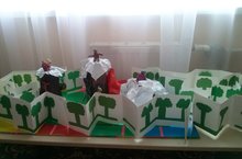 Коллективная работа "Туристы в горах и там сосны высокие"- инициировать самостоятельный поиск для передачи в лепке движений человека, учить вырезать деревья из бумаги сложенной гармошкой.