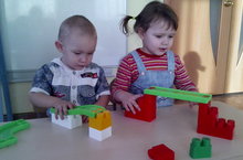 Дети ясельной группы на занятии по конструированию построили мостик для машин.