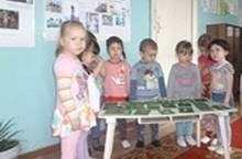 Дети 1 смешанной группы рассматривают свои работы. На занятии по художественному творчеству дети вылепили из пластилина цветы и расположили их на «зеленом лугу» - бумаге зеленого цвета. В работе дети использовали приемы лепки: раскатывание шара и сплющивание шара в диск. Перед занятием дети рассматривали альбом «Цветики - цветочки» и играли в пальчиковую игру «Цветок».