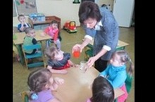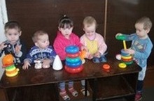 Дети ясельной группы знакомятся с величиной, цветом, выполняют различные практические действия. Они рассматривают и обследуют кольца у пирамид и путем проб и ошибок собирают пирамиду, чередуя кольца по размеру и цвету. Здесь же дети учатся застегивать и расстегивать сандалии и ботинки.