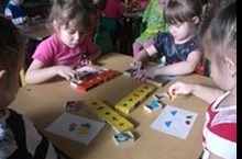Деятельность детей по формированию математических представлений направлена на определение формы предметов. Дети 1 смешанной группы определяли форму предметов визуально и на ощупь. Затем, извлекая геометрические фигуры из индивидуальных пеналов, составляли рисунок.