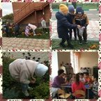 Дети подготовительной группы собирают семена цветов с клумб участка для посадки в будущем году.
