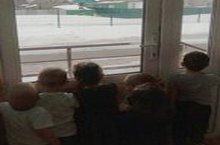 Наши дети наблюдали за уборкой снега с крыши небольшого сарая, находящегося рядом с детским садом. Они смотрели за тем, как жительница очищала лопатой снег. Им было очень интересно.