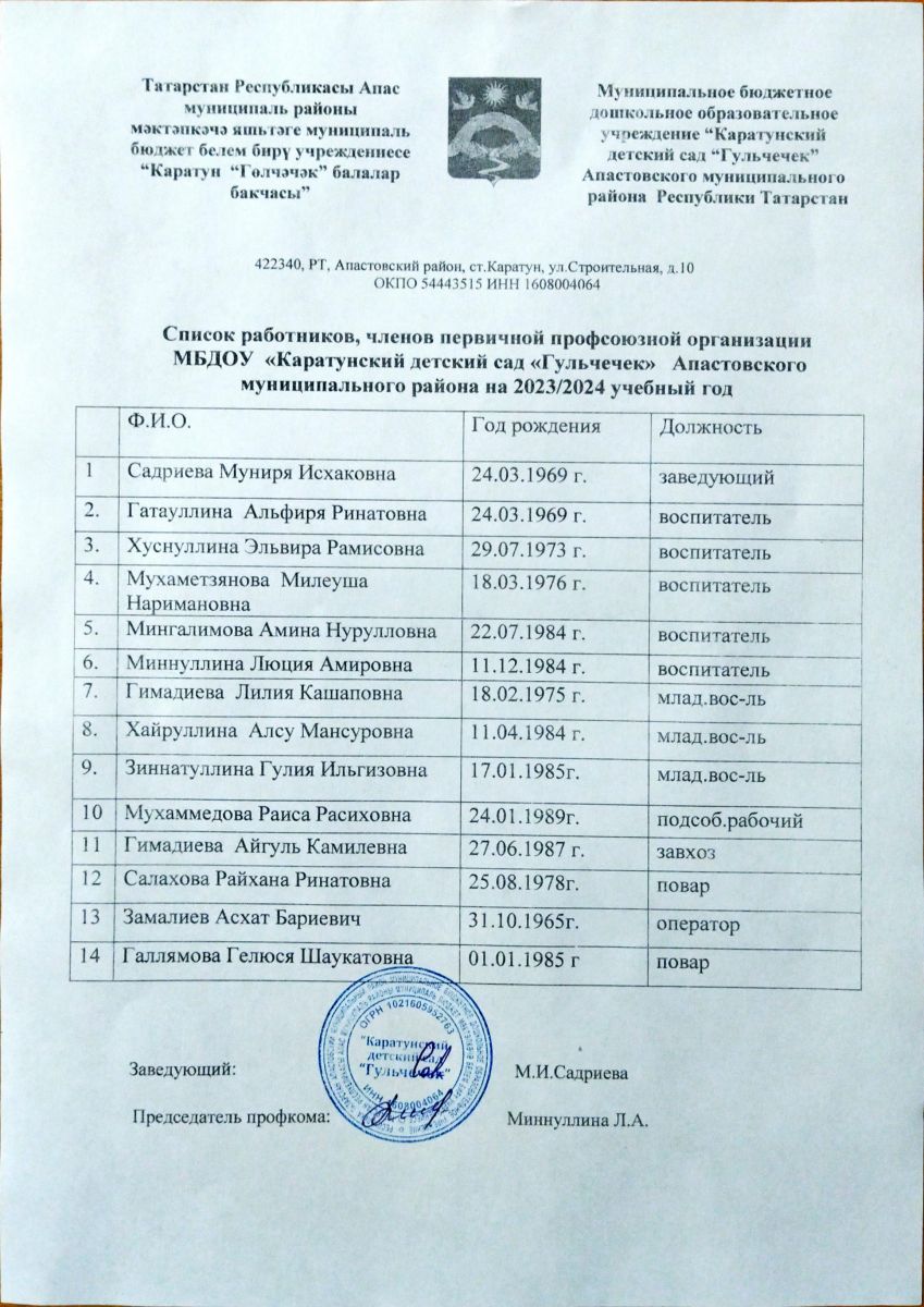 Председатель первичной профсоюзной организации - Миннуллина Люция Амировна, телефон 89393991249, электронная почта - rfkzvjdf@mail.ru