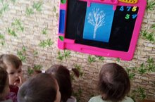 Буген без балалар белән бәс сарган агачларны күзәттек. Аларның матурлыкларына сокландык. Рәсем эшчәнлегендә агачланы тоз ярдәмендә ясадык. Рәсемебез бик матур килеп чыкты. Барыбызга да ошады.