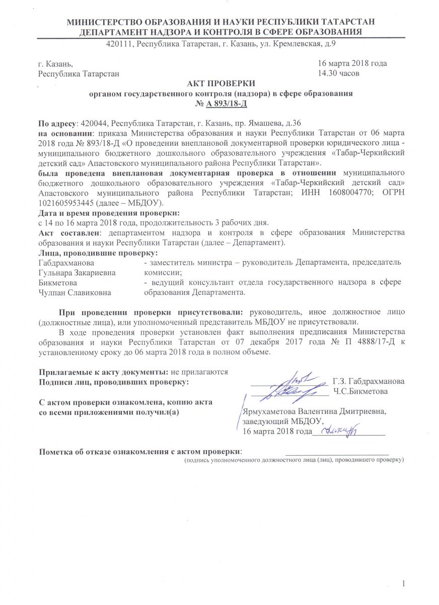 Акт проверки органом государственного контроля (надзора) в сфере образования № А 893/18-д