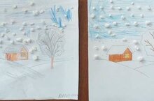 Снег-это аппликация в технике скатывания.Отрываем мелкие кусочки цвеной или белой бумажнй салфетки (размером с ноготок большого пальца),скатываем их между большим и указательым пальцами руки и прилеиваем их к местуна рисунке,предварительно намазанному клеем.