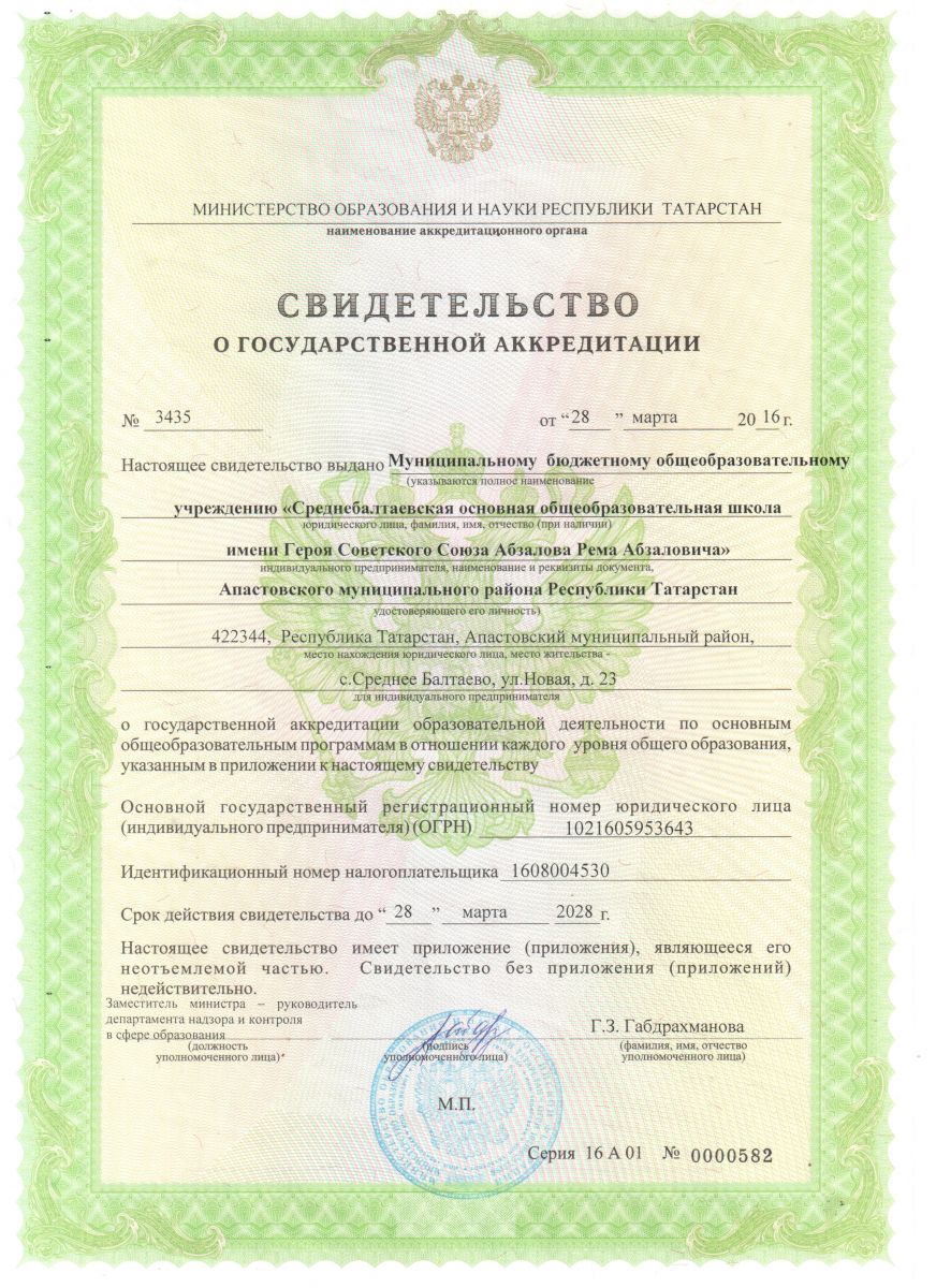 Муниципальное бюджетное общеобразовательное учреждение «Среднебалтаевская основная общеобразовательная школа имени Героя Советского Союза Абзалова Рема Абзаловича» Апастовского муниципального района Республики Татарстан/Татарстан Республикасы Апас муниципаль районы «Советлар Союзы Герое Абзалов Рем Абзал улы исемендәге Урта Балтай төп гомуми белем биру мәктәбе» муниципаль бюджет гомуми белем биру учреждениесе
