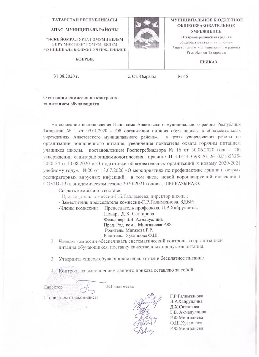 Приказ о создании комиссии по контролю за питанием обучающихся "Комиссия по контролю питания"