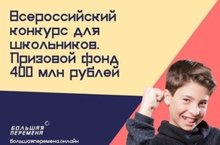 Всероссийский конкурс «Большая перемена» - это онлайн-платформа для образования, развития и коммуникации всех учеников 8-10 классов. Конкурс стартовал 28 марта и пройдет до октября 2020 года. Регистрация участников проходит на сайте https://bolshayaperemena.online до 23 июня. Ключевая цель конкурса – дать возможность каждому подростку раскрыть свои уникальные способности. Главным критерием отбора станет не оценка успеваемости, а наличие навыков, которые пригодятся школьникам в современном мире.В рамках конкурса учащиеся со всей России смогут пройти профессиональные тестирования на эрудицию, профориентацию, интеллект, получить доступ к образовательным программам и рекомендации ведущих экспертов – представителей научной, финансовой, образовательной сфер, искусства и спорта.Первая часть конкурсных испытаний будет проводиться дистанционно на сайте. Очные этапы конкурса пройдут с 20 июля 2020 года. На определенном этапе конкурса к участникам смогут присоединиться их любимые педагоги – вместе они смогут пройти этапы решения кейсов, участвовать в полуфиналах и финале конкурса.Победители «Большой перемены» (300 учащихся 10 классов) получат по 1 миллиону рублей на оплату обучения в вузе (средства также можно направить на проезд к месту учебы или, в случае поступления на бюджетное отделение, на ипотеку). Также победители смогут получить до 5 баллов к портфолио достижений для поступления в вуз. Учащиеся 8-9 классов (300 победителей) смогут получить по 200 тысяч рублей на дополнительное образование и саморазвитие. Все финалисты (1200 человек) получат путевки в «Артек» - ведущий образовательный центр страны. 20 лучших школ смогут получить финансовую поддержку (по 2 миллиона рублей), а педагоги, подготовившие финалистов, смогут пройти образовательные программы в лучших центрах страны.