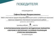 Апас урта мәктәбенең китапханә мөдире Сафина Венера Ф. Татарстан Республикасы Мәгарифны Үстерү институтының II дәрәҗәдәге дипломга лаек булды -