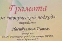 Ученица 4в класса Насибуллина Гузель под руководством Гумеровой Р.Г. приняла активное участие в республиканском конкурсе детского творчества «Таланты Татарстана». Ее работа была удостоена грамотой за «творческий поиск».