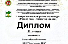 Фазлеев Д., ученик 5 класса, удостоился диплома II степени II Межрегионального фестиваля-конкурса «Родной язык — богатство народа»(руководитель учитель технологии Латыпов М.Г.)