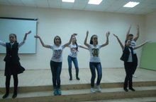 В актовом зале школы идёт подготовка 7 а класса к новогоднему празднику. Девушки репетируют танец "На все четыре стороны света". Желаем успехов вам.
