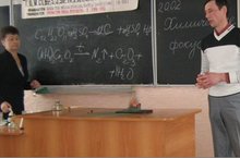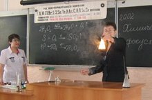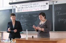 Учитель химии Хайдарова М.Х. и ученица 11В класса Габдрахманова А.Учителя химии продемонстрировали занимательные опыты по химии. Встреча была очень злободневной, так как выпускникам скоро необходимо будет сделать выбор с будущей профессией