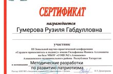 Гумерова Р.Г. участвовала в зональной научно-практической конференции «Сердцем прикоснитесь к подвигу» имени Гильфанова Фаниса Азгамовича и награждена сертификатом за публикацию методической разработки классного часа по развитию патриотизма в сборнике конференции.