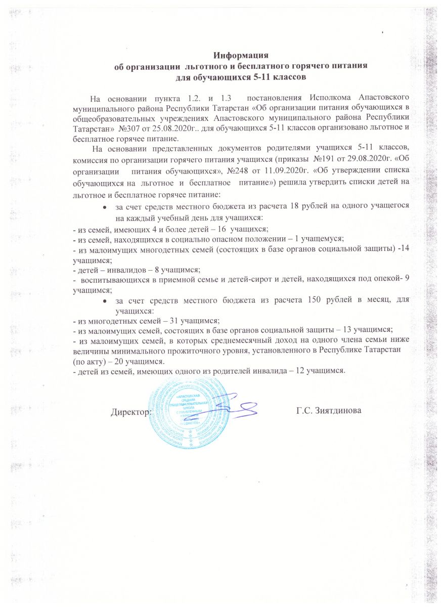 Приказ об утверждении списка обучающихся МБОУ Апастовская СОШ на льготное и бесплатное питание