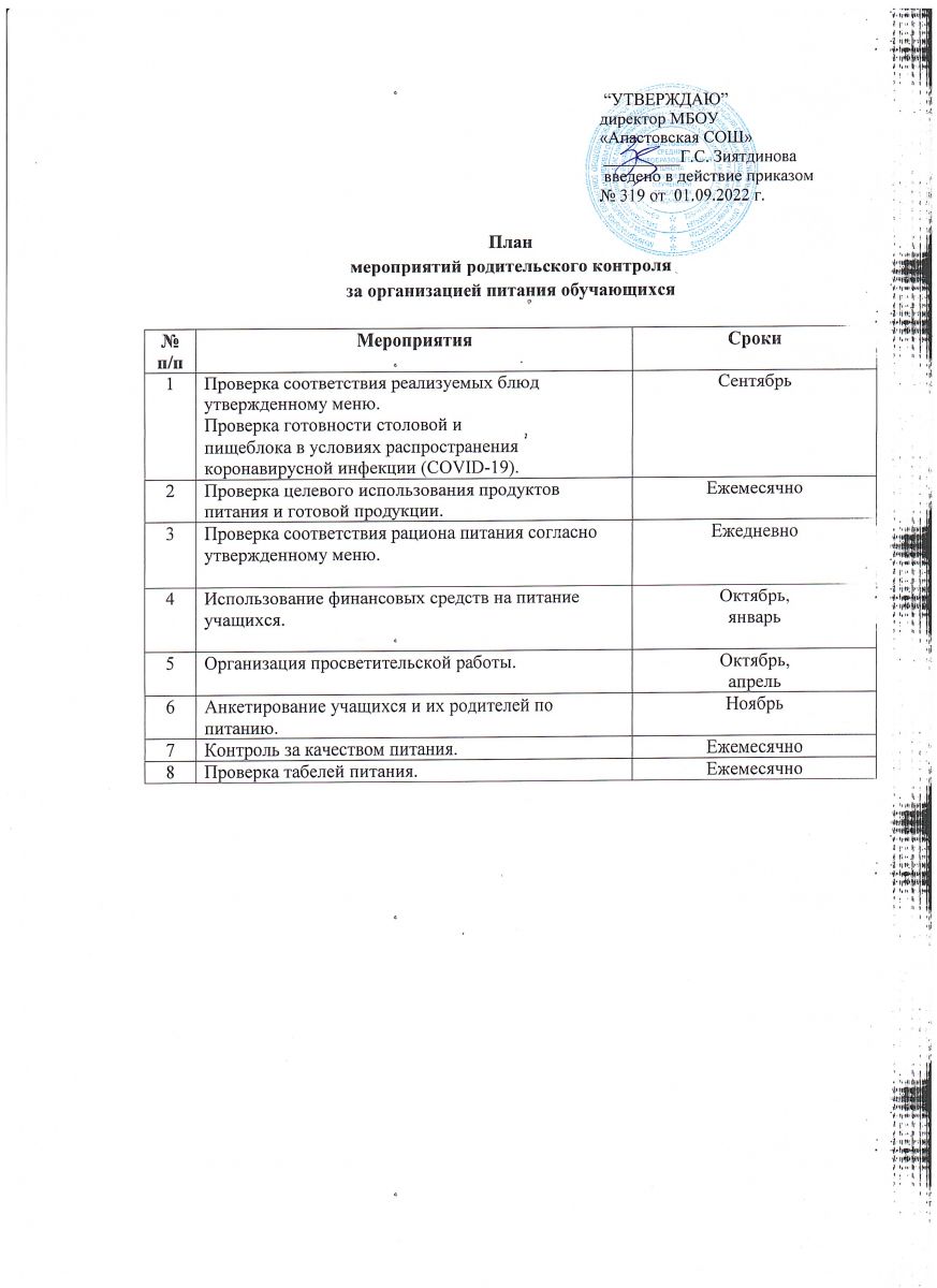 План мероприятий родительского контроля за организацией питания - 2022-2023 у.г.