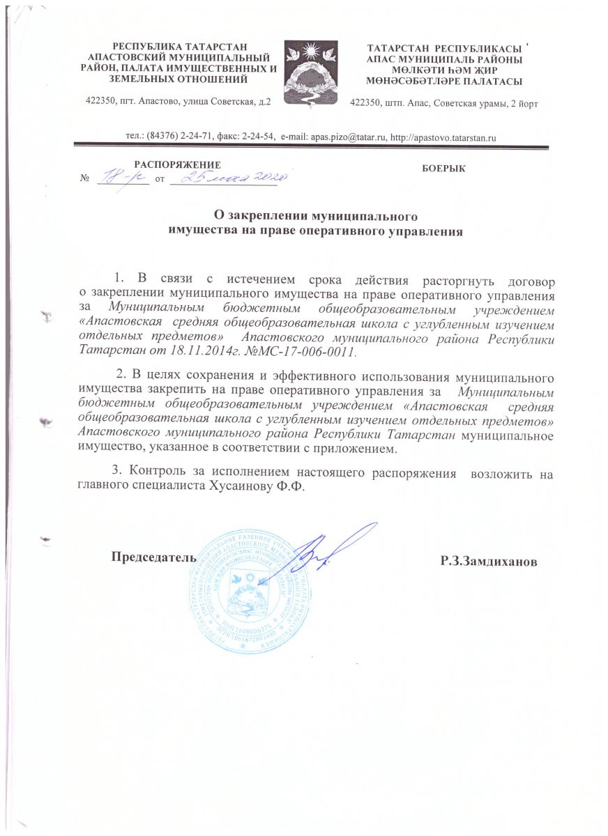 Распоряжение о закреплении муниципального имущества на праве оперативного управления 2020 25.05