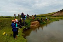 А затем воспитанники лагеря работали над созданием флага и герба своего лагеря. Во второй половине дня мы ходили на рыбалку и вернулись с хорошим уловом.