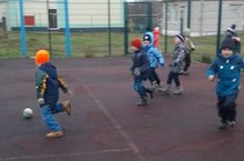 Футбол уйнадык. 21.11.2019 Балаларны мөстәкыйль рәвештә хәрәкәтле уеннар уйнау максатыннан, без мәктәп площадкасына футбол уйнарга бардык.Тупны уң һәм сул аяк белән тиешле юнәлештә тибеп бару, тупны предметлар арасыннан йортү, капкага тәгәрәтеп кертү. Капма-каршы басып, аяк белән туп бирешү; тупны рәттән берничә тапкыр стенага бәрдерү.