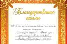 Гатауллина Фаягуль , ученица 7 класса , получила Благодарственное письмо за активное участие в муниципальном этапе Республиканского конкурса чтецов «Во имя мира на земле» , посвященного к 70-летию Великой Победы. Фаягуль, желаем тебе здоровья , творческих успехов и стать настоящим патриотом своей Родины!