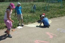 Бүген 2 июнь.Отрядлар үзләренә исемнәр сайладылар һәм асфальтта отряд урыннарын бизәделәр. 1 отряд – “ Гөлләрем” , 2 отряд “ Сандугач” исемен йөртә.