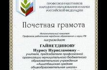 Мәктәбебездә 31 ел башлангыч профсоюз оешмасын җитәкләгән Гайнетдинова Нурисә Нурислам кызы Профсоюзда күп еллык актив хезмәте өчен Россия Федерациясе Мәгариф һәм фән хезмәткәрләренең профсоюз оешмасы тарафыннан Мактау грамотасы белән бүләкләнде.