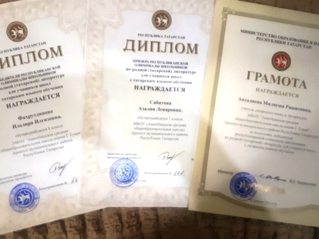 Татар әдәбиятыннан үткән республика олимпиадасының йомгаклау этабында 8 нче класс укучысы Фәхретдинова И. — җиңүче, 7 класс укучысы Сабитова А. призер булдылар. Укучыларыбызны һәм аларның укытучылары Әүхәдиева М.Р. ны зур җиңүләре белән чын күңелдән котлыйбыз. -