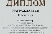На базе МБОУ "Гимназия №7" Ново-савинского района г.Казани состоялась XIV республиканская научно-практическая конференция школьников имени Л.Н.Толстого. На конференции принял участие ученик 9В класса Хакимов Ильдар (научный руководитель Хакимова Р.А.). Ильдар представил свою работу в секции "Авторские работы, посвященные одной из книг (по литературе), вошедших в перечень "100 книг" по истории, культуре и литературе народов РФ и удостоился Диплома III степени.