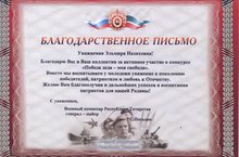 Коллектив и директор школы был награжден благодарственным письмом от Военного комисариата РТ генерал – майора С.Н. Погодина.