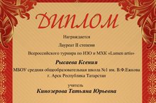 Поздравляем лауреата 2 степени Всероссийского турнира по ИЗО и МХК "Lumen artis", ученицу 9 "А" класса, Рысаеву Ксению (учитель Кинозерова Т.Ю.)