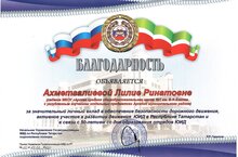 На районном этапе Республиканского конкурса «Лучший отряд ЮИД по итогам 2022/2023 года и лучший руководитель» среди общеобразовательных школ Арского муниципального района РТ руководитель отряда ЮИД «БеРКуД» нашей школы Ахметгалиева Лилия Ринатовна стала победителем. Ей так же объявлена Благодарность за значительный вклад в обеспечение безопасности дорожного движения, активное участие в развитии движения ЮИД в РТ и в связи с 50-летием со дня образования отрядов ЮИД за подписью начальника Управления Госавтоинспекции МВД по РТ подполковника полиции Р.Р. Гарипова.