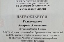 Поздравляем призера Республиканской олимпиады школьников по основам безопасности жизнедеятельности Галяветдинова Амирхана, 4 «Б» класс и учителя Никитину Ирину Николаевну.