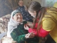 Сугыш... Аның иләмсез йөзе халкыбыз хәтереннән мәңге китмәс. “Сугыш - хатын-кыз өчен түгел...”. Хатын-кыз өчен түгел дә бит, тик сугыш елларында хатын-кыз җилкәсенә күп авырлык һәм хәсрәтләр туры килде. Нәфис һәм гүзәл затларыбыз, киләчәк буыннарның тормышын яклап, Ватанны саклар өчен, кулларына корал алырга мәҗбүр булды. Тылда калганнары көнне – төнгә ялгап эшләде. Күпме авырлык күрсәләр дә,алар нык торды,бирешмәде. 5 нче май көнендә “Патриот” Һәм волонтерлар отрядына йөрүче укучыларыбыз (җитәкчеләре Сираҗиева Н.Ф.) шушы горур хатын – кызларыбыз белән очрашып хәлләрен белештеләр.Аларга бәйрәм котлавы итеп открытка Һәм өчпочмаклы хат бүләк иттеләр.