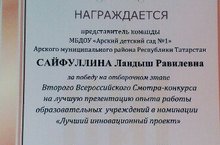 Поздравляем воспитателя Сайфуллину Ландыш Равилевну с победой на отборочном этапе Второго Всероссийского Смотра - конкурса за лучшую презентацию опыта работы образовательных учреждений в номинации "Лучший инновационный проект". Желаем ей дальнейшех успехов и новых побед!